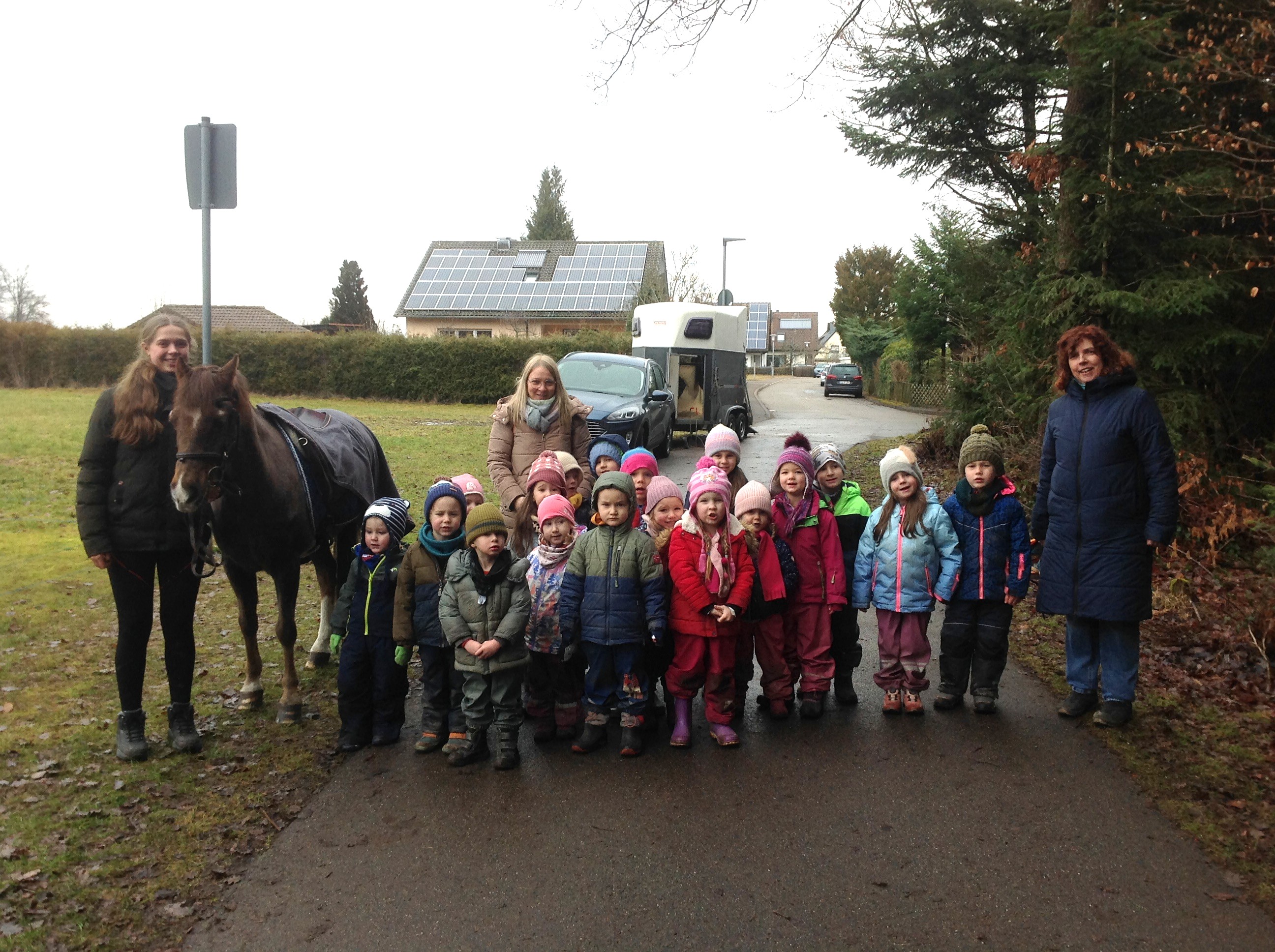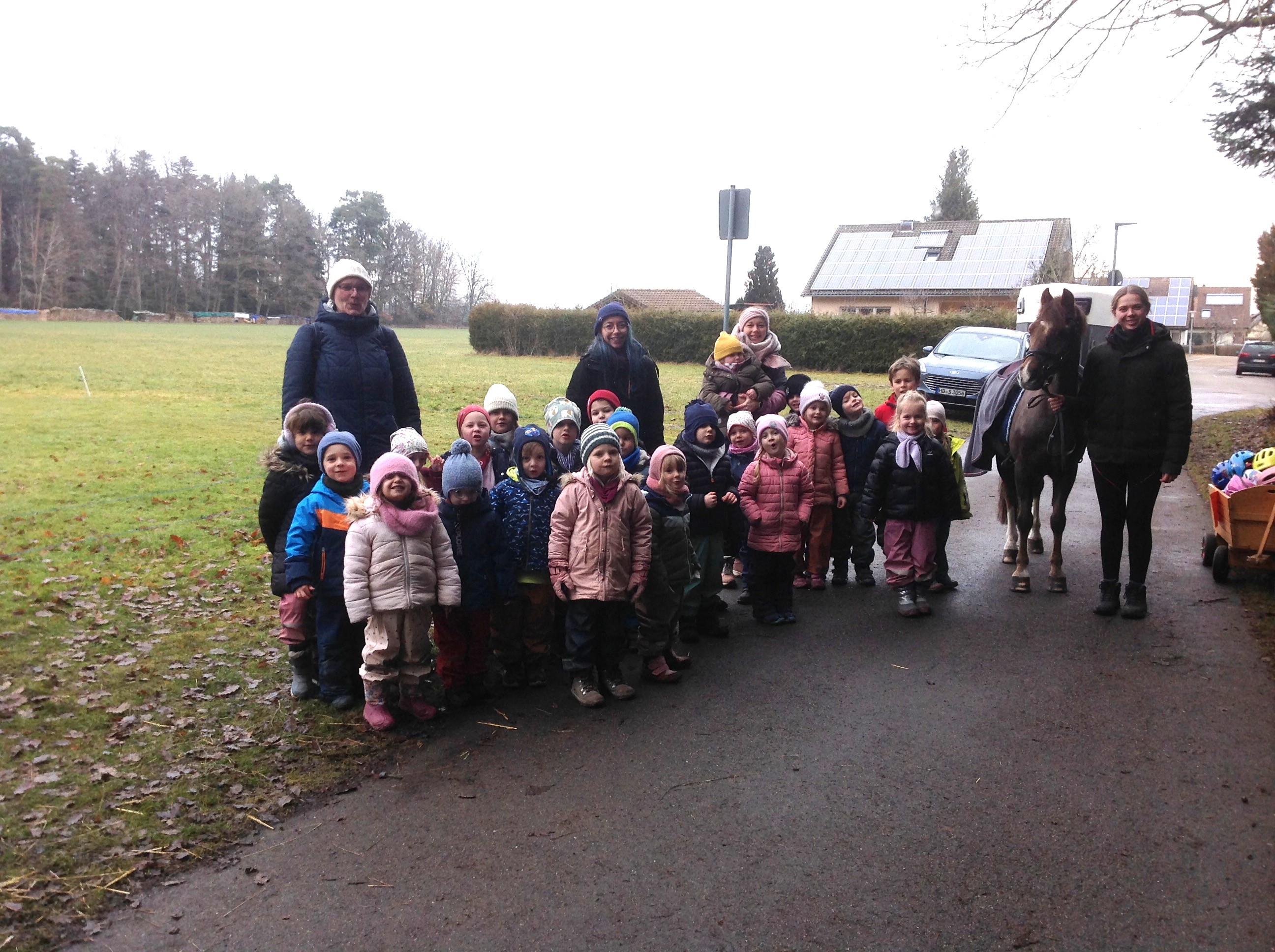 In der Kita beschäftigten wir uns in den letzten Wochen mit dem Thema Bauernhof. Zu diesem Projekt gab es unterschiedliche Lieder und Spiele. Natürlich wurde auch über die Tiere des Bauernhofs gesprochen. Leider gibt es in Monakam keinen Bauernhof. Um so schöner war es, dass die Kinder Besuch von einem echten Pony bekamen. In Verbindung mit unserem freitäglichen Naturtag, brachte Familie Vejsada ihr Pony „Fresco“ mit dem Pferdeanhänger an den Monakamer Bolzplatz. Im Vorfeld wurde im Morgenkreis darüber gesprochen, wie man sich in der Nähe eines Pferdes verhält. Nun durften die Kita-Kinder in drei Gruppen hautnahe Erfahrungen mit dem Pony machen. Dazu gehörte eine kleine Lerneinheit über das Futter und Putzzeug. Das Highlight war natürlich das Streicheln des Ponys und jedes Kind durfte eine kleine Runde auf Fresco reiten. Die Kinder durften Fresco nach dem Reiten noch mit Möhren verwöhnen, bevor sie den Rückweg in die Kita antraten. Mit viel Begeisterung erzählten die Kinder auch Tage später noch von Fresco. Wir bedanken uns herzlich bei Familie Vejsada, die den Kindern diese Erfahrungen ermöglicht hat.